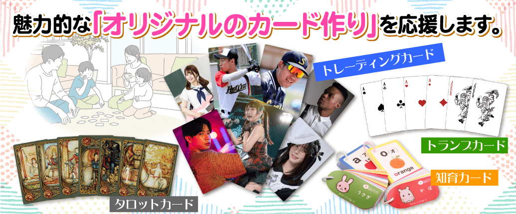 このたび「型抜きランド」では、新たにオリジナルカード印刷の商品ページを開設いたしました。トランプ・トレーディングカード・ゲームカード・タロットカード・知育カードと、幅広い用途のカード印刷に対応しています。